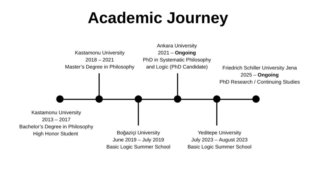 I commenced my doctoral studies in the Department of Philosophy, Systematic Philosophy and Logic at Ankara University in 2021, and have been continuing my doctoral research at Friedrich Schiller University since the Fall semester of 2025. I completed my undergraduate education in Philosophy at Kastamonu University between 2013 and 2017; during the Fall semester of 2016–2017, I participated in the Erasmus Exchange Program at the University of Warsaw. During my undergraduate studies,…